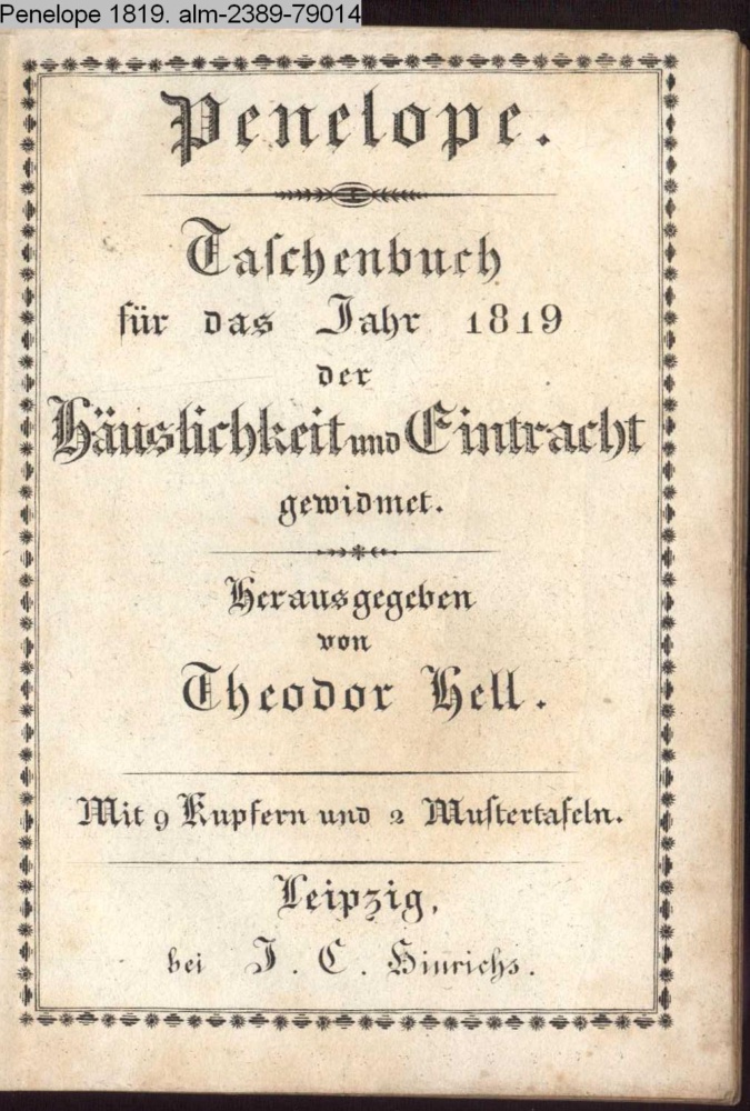 Penelope. / Taschenbuch / für das Jahr 1819 / der / Häuslichkeit und Eintracht / gewidmet. / Herausgegeben / von / Theodor Hell. / Mit 9 Kupfern und 2 Mustertafeln. / Leipzig, / bei J. C. Hinrich