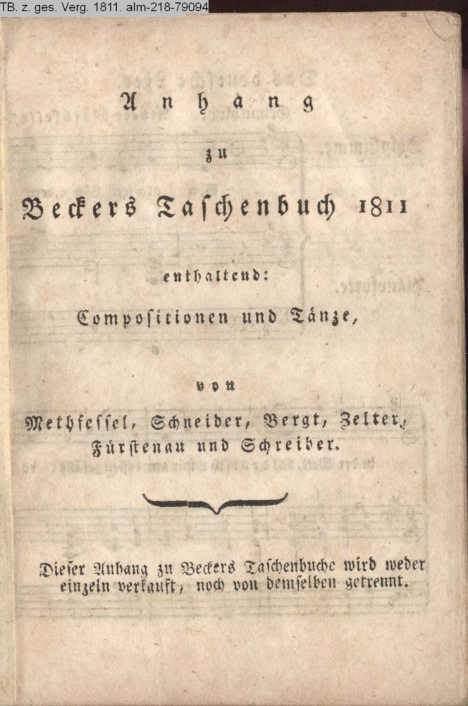 Anhang / zu / Beckers Taschenbuch 1811 / enthaltend: / Compositionen und Tänze, / von / Methfessel, Schneider, Bergt, Zelter, / Fürstenau und Schreiber. / Dieser Anhang zu Beckers Taschenbuche wird weder / einzeln verkauft, noch von demselben / getrennt