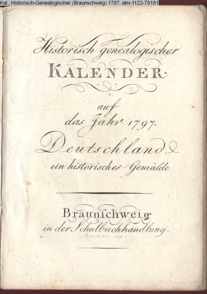 Historisch genealogischer / KALENDER / auf / das Jahr 1797. / Deutschland, / ein historisches Gemälde. / Braunschweig / in der Schulbuchhandlung