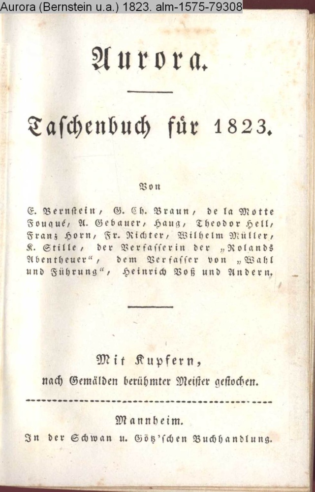 Aurora. / Taschenbuch für 1823. / Von E. Bernstein, G. Chr. Braun, de la Motte / Fouqué, A. Gebauer, Haug, Theodor Hell, / Franz Horn, Fr. Richter, Wilhelm Müller, / K. Stille, der Verfasserin der »Rolands / Abentheuer«, dem Verfasser von »Wahl / und Führung«, Heinrich Voß und Andern. / Mit Kupfern, / nach Gemälden berühmter Meister gestochen. / Mannheim. / In der Schwan u. Götz'schen Buchhandlung
