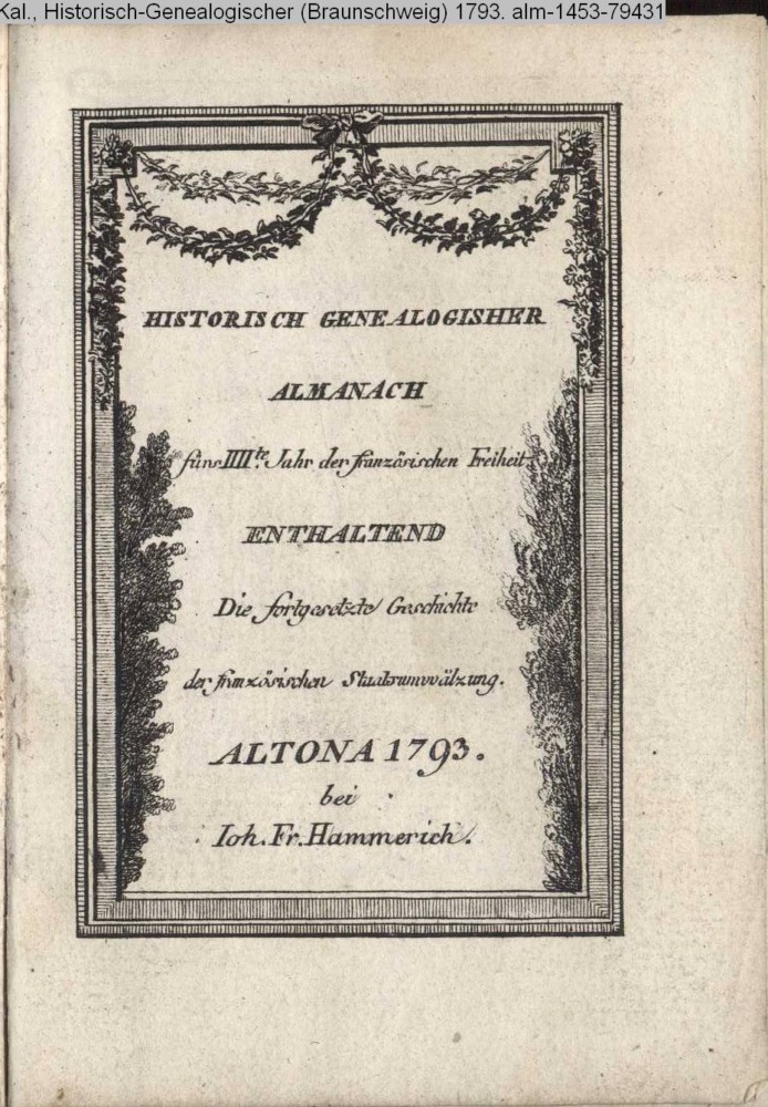 HISTORISCH GENEALOGISHER [sic] / ALMANACH / fürs IIIIte. Jahr der französischen Freiheit / ENTHALTEND / Die fortgesetzte Geschichte / der französischen Staatsumwälzung. / ALTONA 1793. / bei / Joh. Fr. Hammerich