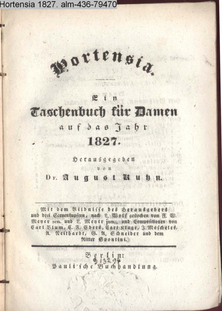 Hortensia. / Ein / Taschenbuch für Damen / auf das Jahr / 1827. / Herausgegeben / von / Dr. August Kuhn. / Mit dem Bildnisse des Herausgebers / und drei Scenekupfern, nach L. Wolf gestochen von F. W. / Meyer sen. und L. Meyer jun., und Compositionen von / Carl Blum, C. F. Ebers, Carl Klage, I. Moscheles, / A. Neithardt, G. A. Schneider und dem / Ritter Spontini. / Berlin: / Pauli'sche Buchhandlung