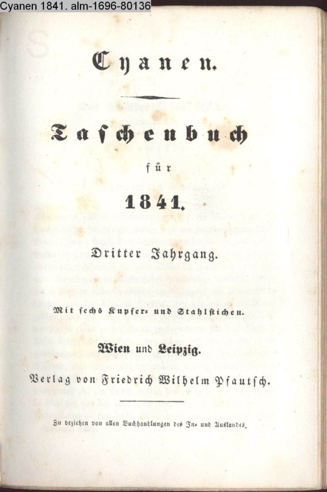Cyanen. / Taschenbuch / für / 1841. / Dritter Jahrgang. / Mit sechs Kupfer-und Stahlstichen. / Wien und Leipzig. / Verlag von Friedrich Wilhelm Pfautsch. / Zu beziehen von allen Buchhandlungen des In- und Auslandes