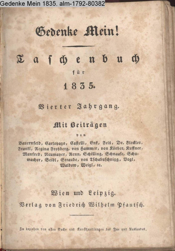 Gedenke Mein! / Taschenbuch / für / 1835. / Vierter Jahrgang. / Mit Beiträgen / von / Bauernfeld, Carlopago, Castelli, Enk, Fels, Dr. Fleckles, / Frankl, Regina Frohberg, von Hammer, von Körber, Kuffner, / Manfred, Neumayer, Renn, Schilling, Schnaase, Schu- / macher, Seidl, Straube, von Tschabuschnigg, Vogl, / Waldow, Weigl, etc. / Wien und Leipzig. / Verlag von Friedrich Wilhelm Pfautsch. / Zu beziehen von allen Buch - und Kunsthandlungen des In - und Auslandes