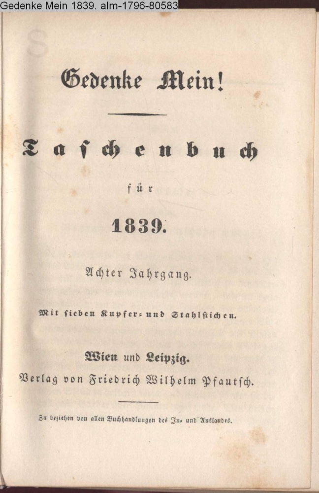 Gedenke Mein! / Taschenbuch / für / 1839. / Achter Jahrgang. / Mit sieben Kupfer- und Stahlstichen. / Wien und Leipzig. / Verlag von Friedrich Wilhelm Pfautsch. / Zu beziehen von allen Buch- und Kunsthandlungen des In- und Auslandes