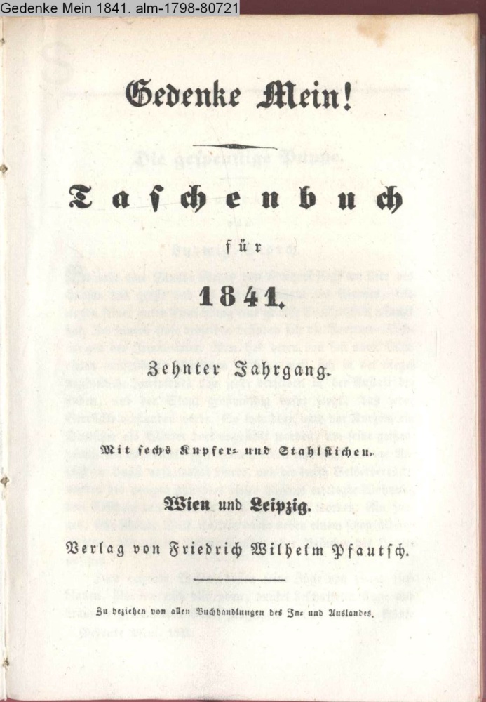 Gedenke Mein! / Taschenbuch / für / 1841. / Zehnter Jahrgang. / Mit sechs Kupfer- und Stahlstichen. / Wien und Leipzig. / Verlag von Friedrich Wilhelm Pfautsch. / Zu beziehen von allen Buchhandlungen des In- und Auslandes