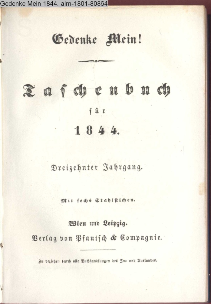 Gedenke Mein! / Taschenbuch / für / 1844. / Dreizehnter Jahrgang. / Mit sechs Stahlstichen. / Wien und Leipzig. / Verlag von Pfautsch & Compagnie. / Zu beziehen durch alle Buchhandlungen des In- und Auslandes