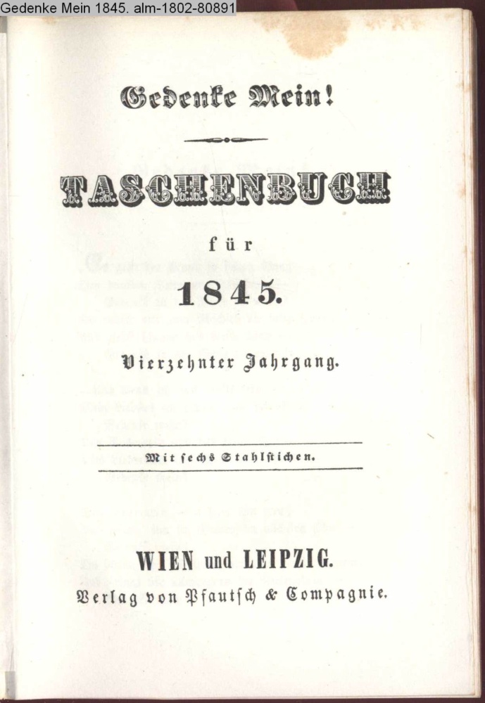 Gedenke Mein! / TASCHENBUCH / für / 1845. / Vierzehnter Jahrgang. / Mit sechs Stahlstichen. / WIEN und LEIPZIG. / Verlag von Pfautsch & Compagnie