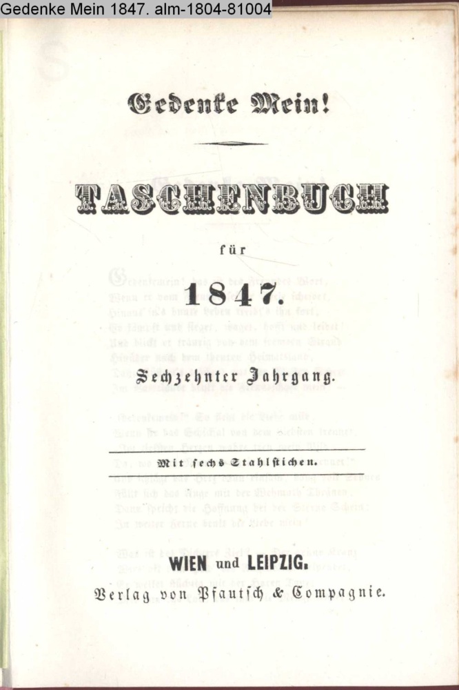 Gedenke Mein! / TASCHENBUCH / für / 1847. / Sechzehnter Jahrgang. / Mit sechs Stahlstichen. / WIEN und LEIPZIG. / Verlag von Pfautsch & Compagnie