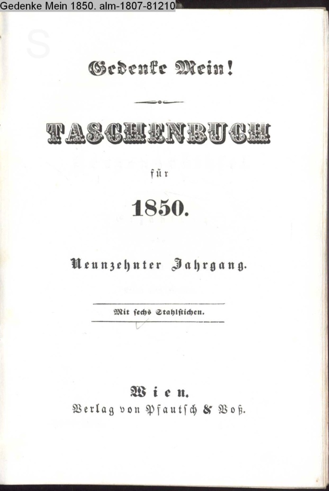 Gedenke Mein! / TASCHENBUCH / für / 1850. / Neunzehnter Jahrgang. / Mit sechs Stahlstichen. / Wien. / Verlag von Pfautsch & Voß