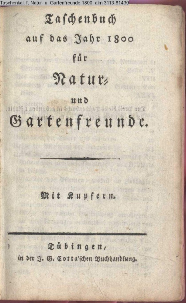 Taschenbuch / auf das Jahr 1800 / für / Natur- und / Gartenfreunde. / Mit Kupfern. / Tübingen, / in der J. G. Cotta'schen Buchhandlung