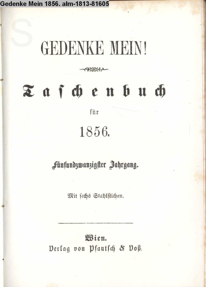 GEDENKE MEIN! / Taschenbuch / für / 1856. / Fünfundzwanzigster Jahrgang. / Mit sechs Stahlstichen. / Wien. / Verlag von Pfautsch & Voß