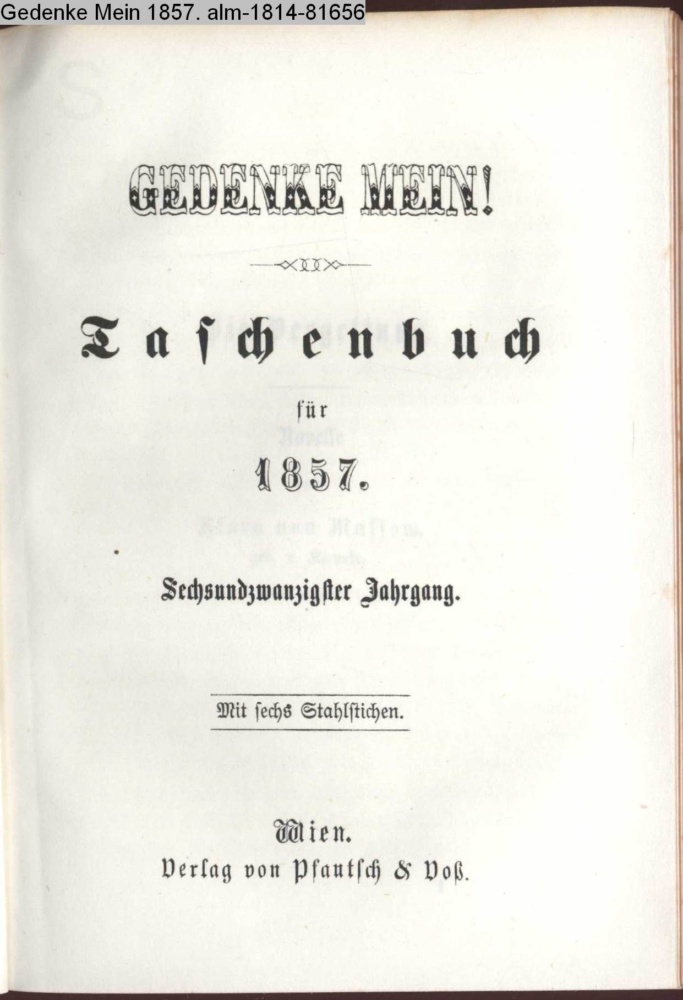 GEDENKE MEIN! / Taschenbuch / für / 1857. / Sechsundzwanzigster Jahrgang. / Mit sechs Stahlstichen. / Wien. / Verlag von Pfautsch & Voß