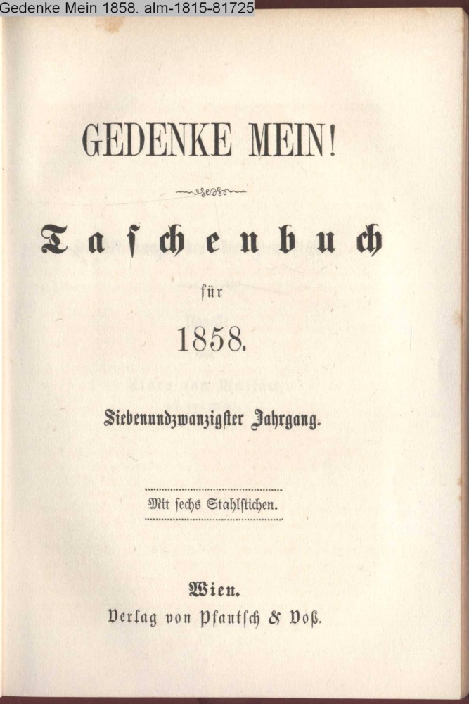 GEDENKE MEIN! / Taschenbuch / für / 1858. / Siebenundzwanzigster Jahrgang. / Mit sechs Stahlstichen. / Wien. / Verlag von Pfautsch & Voß
