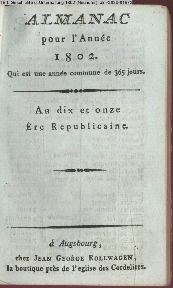 Taschenbuch / für / Geschichte und Unterhaltung, / auf das Jahr 1802. / Herausgegeben / von / G. A. Neuhofer. / Fünfter Jahrgang. / Augsburg, / bey Johann Georg Rollwagen, / unter der Barfüßer Kirche