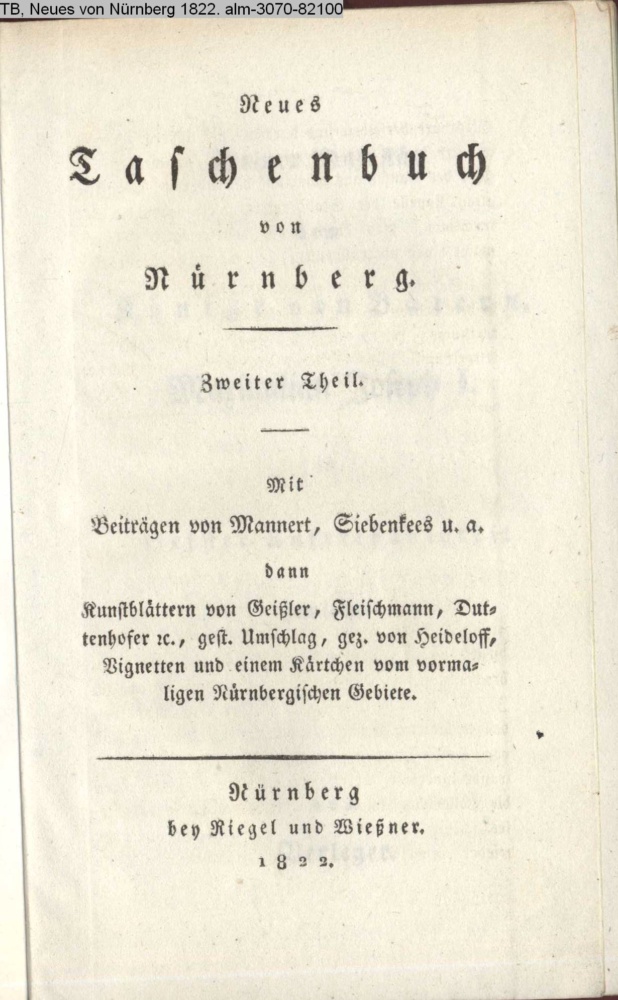 Neues / Taschenbuch / von Nürnberg. / Zweiter Theil. / Mit / Beiträgen von Mannert, Siebenkees u. a. / dann / Kunstblättern von Geißler, Fleischmann, Du- / tenhofer etc, gest. Umschlag, gez. von Heideloff, Vignetten und einem Kärtchen vom vor- / maligen Nürnbergischen Gebiete. / Nürnberg / bey Riegel und Wießner. / 1822