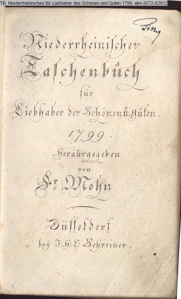 Niederrheinisches / Taschenbuch / für / Liebhaber des Schönen u. Guten. / 1799. / Herausgegeben / von / Fr. Mohn / Düsseldorf / bey J. H. L. Schreiner