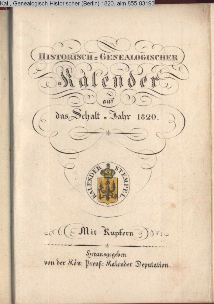 HISTORISCH-GENEALOGISCHER / Kalender / auf / das Schalt-Jahr 1820. / Mit Kupfern / Herausgegeben / von der Kön. Preuß. Kalender-Deputation