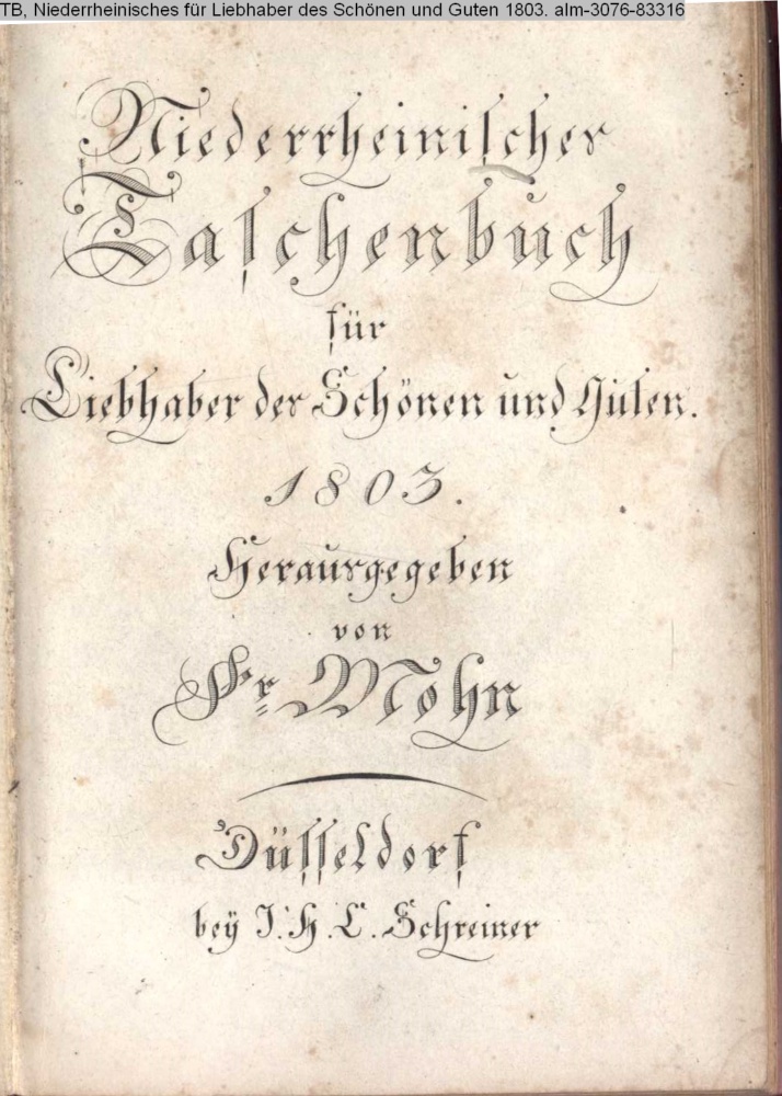 Niederrheinisches / Taschenbuch / für / Liebhaber des Schönen und Guten. / 1803. / Herausgegeben / von / Fr Mohn / Düsseldorf / bey J. H. L. Schreiner