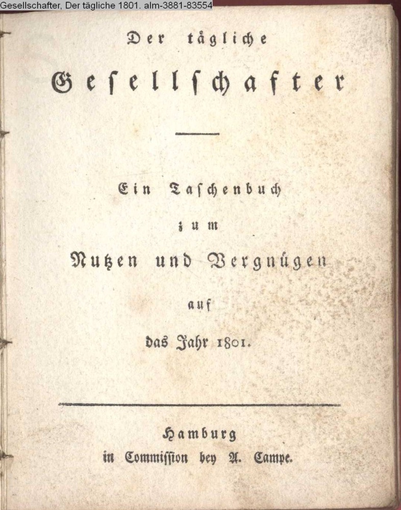Der tägliche Gesellschafter / Ein Taschenbuch / zum / Nutzen und Vergnügen / auf / das Jahr 1801. / Hamburg / in Commisssion bey A. Campe