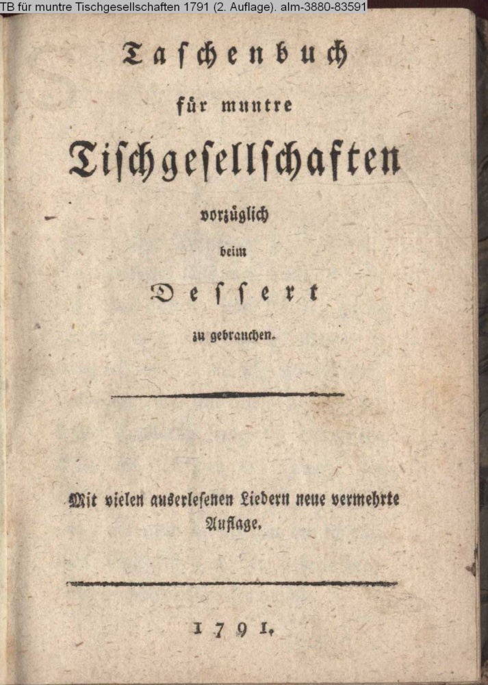 Taschenbuch / für muntre / Tischgesellschaften / vorzüglich / beim / Dessert / zu gebrauchen. / Mit vielen auserlesenen Liedern neue vermehrte / Auflage. / 1791