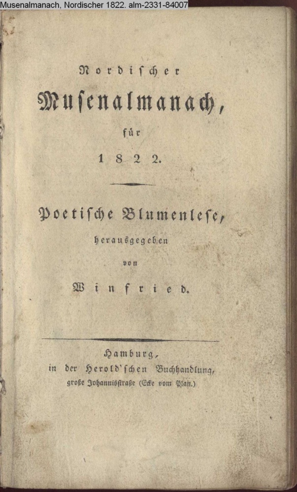 Nordischer / Musenalmanach, / für / 1822. / Poetische Blumenlese, / herausgegeben / von / Winfried. / Hamburg, / in der Herold'schen Buchhandlung, / große Johannisstraße (Ecke vom Plan.)