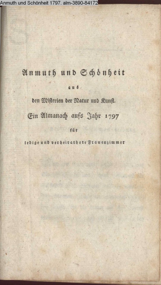Anmuth und Schönheit / aus / den Misterien der Natur und Kunst / für ledige und verheirathete Frauenzimmer. / mit Kupfern. / Berlin, 1797. / bey Oehmigke dem Jüngern