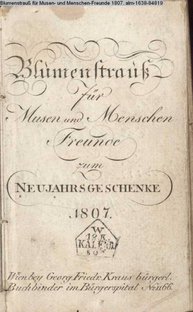 Blumenstrauß / für / Musen und Menschen / Freunde / zum / NEUJAHRSGESCHENKE / 1807. / Wien bey Georg Friedr. Kraus bürgerl. / Buchbinder im Bürgerspital No 1166