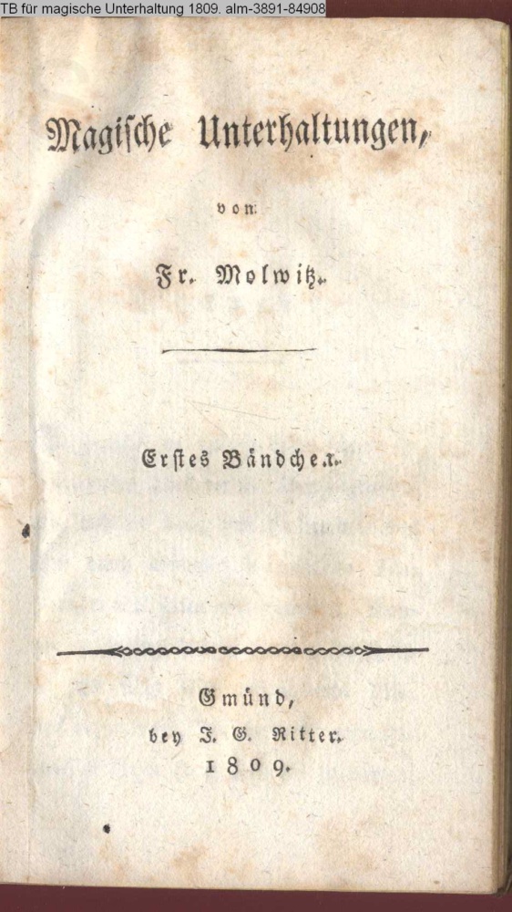 Magische Unterhaltungen / von / Fr. Molwitz. / Erstes Bändchen. / Gmünd, / bey J. G. Ritter / 1809