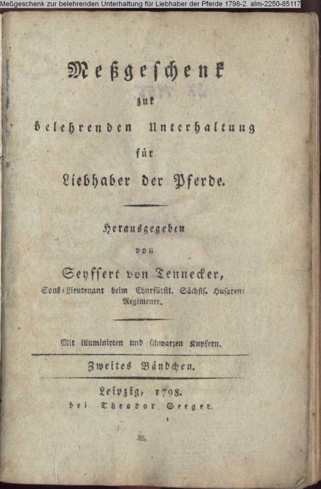 Meßgeschenk / zur / belehrenden Unterhaltung / für / Liebhaber der Pferde. / Herausgegeben / von / Seyffert von Tennecker, / Sous-Lieutenant beim Churfürstl. Sächsis. Husaren- / Regimente / Mit illuminirten und schwarzen Kupfern. / Zweites Bändchen. / Leipzig, 1798 / bei Theodor Seeger