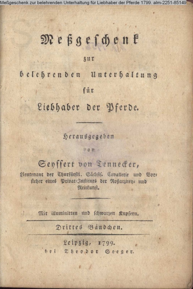 Meßgeschenk / zur / belehrenden Unterhaltung / für / Liebhaber der Pferde. / Herausgegeben / von / Seyffert von Tennecker, / Lieutenant der Churfürstl. Sächsis. Cavallerie und Vor- / steher / eines Privat-Instituts der Roßarzney- und / Reitkunst. / Mit illuminirten und schwarzen Kupfern. / Drittes Bändchen / Leipzig, 1799. / bei Theodor Seeger