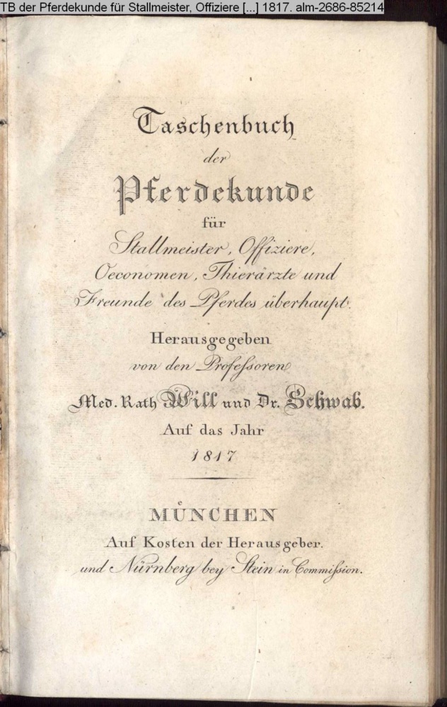Taschenbuch / der / Pferdekunde / für / Stallmeister, Offiziere, / Oeconomen, Thierärzte und / Freunde des Pferdes überhaupt. / Herausgegeben / von den Professoren / Med. Rath Will und Dr. Schwab. / Auf das Jahr / 1817 / MÜNCHEN / Auf Kosten der Herausgegeber. / und Nürnberg bey Stein in Commission