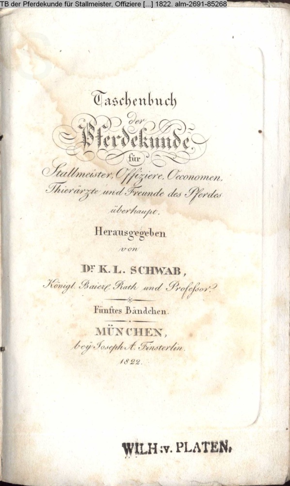 Taschenbuch / der / Pferdekunde / für / Stallmeister, Offiziere, Oeconomen, / Thierärzte und Freunde des Pferdes / überhaupt. / Herausgegeben von. / Dr. K. L. SCHWAB, / Königl. Baier. Rath und Professor. / Füntes Bändchen. / MÜNCHEN, / bey Joseph A. Finsterlin. / 1822