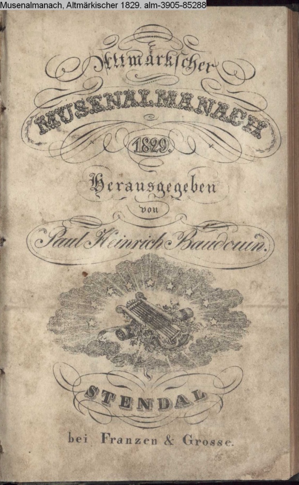 Altmärkischer / Musen-Almanach / für das Jahr 1829. / Herausgegeben / von / Paul Heinrich Baudouin. / Auf Kosten des Herausgebers, gedruckt bei Franzen und Große in Stendal