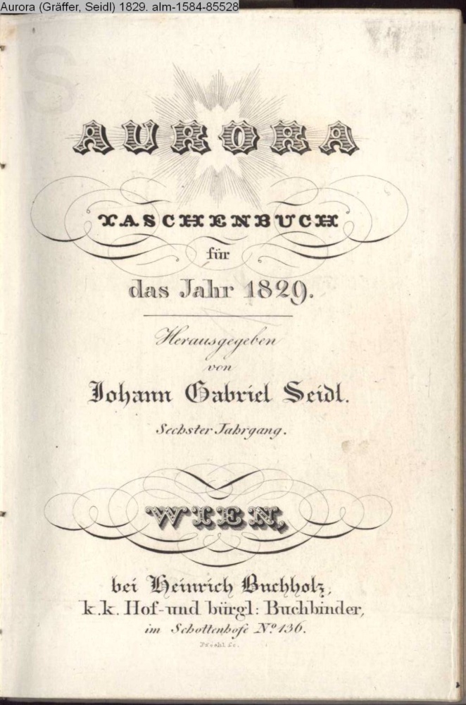 AURORA / TASCHENBUCH / für / das Jahr 1829. / Herausgegeben / von / Johann Gabriel Seidl. / Sechster Jahrgang. / WIEN, / bei Heinrich Buchholz, / k.k. Hof - und bürgl. Buchbinder, / im Schottenhofe No. 136