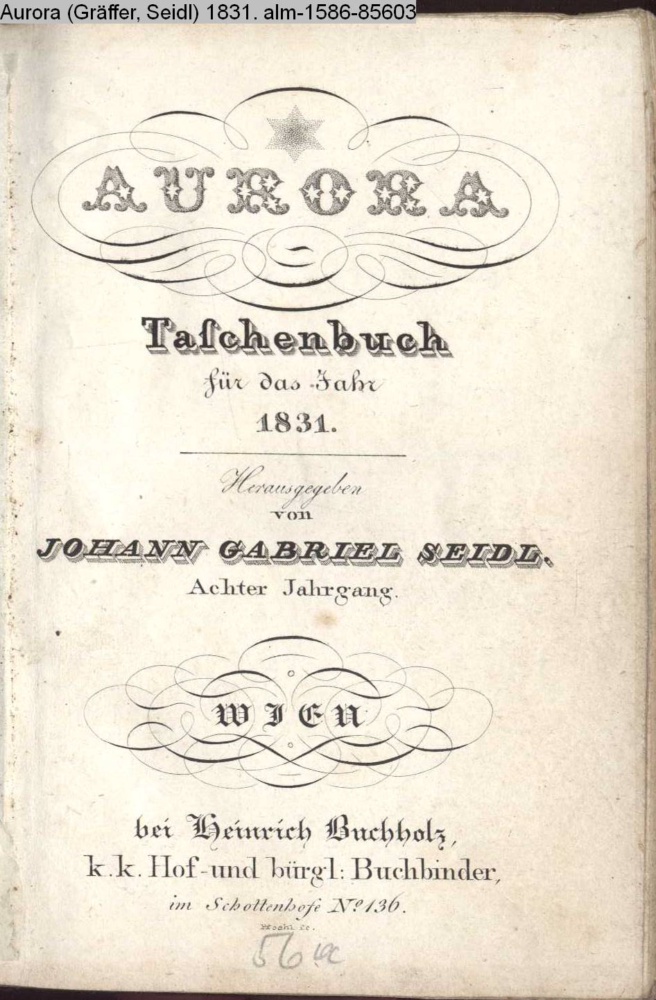 AURORA / Taschenbuch / für / das Jahr / 1831. / Herausgegeben / von / JOHANN GABRIEL SEIDL. / Achter Jahrgang. / WIEN / bei Heinrich Buchholz, / k.k. Hof- und bürgl. Buchbinder, / im Schottenhofe No. 136