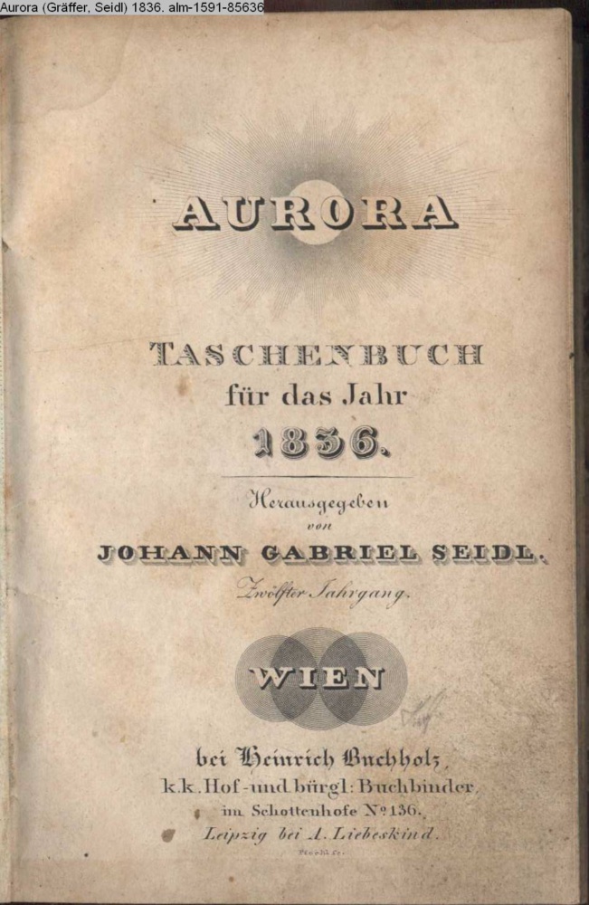 AURORA / TASCHENBUCH / für das Jahr / 1836. / Herausgegeben / von / JOHANN GABRIEL SEIDL. / Zwölfter Jahrgang. / WIEN / bei Heinrich Buchholz, / k.k. Hof- und bürgel: Buchbinder, / im Schottenhofe No 136. / Leipzig bei A. Liebeskind