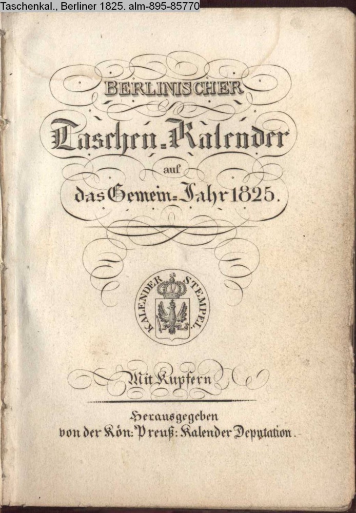BERLINISCHER / Taschen-Kalender / auf / das Gemein-Jahr 1825. / Mit Kupfern / Herausgegeben / von der Kön. Preuß. Kalender-Deputation