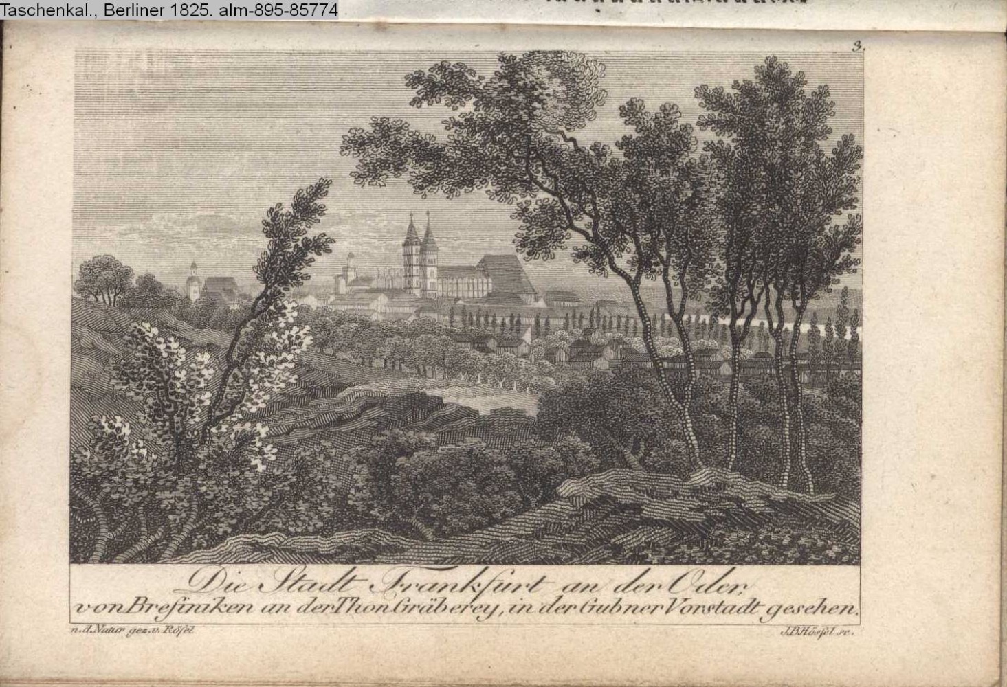 Die Stadt Frankfurt an der Oder, / von der Bresiniken an der Thon-Gräberey, in der Gubner Vorstadt gesehen.