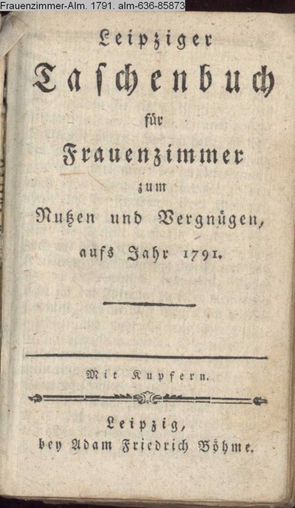 Leipziger / Taschenbuch / für / Frauenzimmer / zum Nutzen und Vergnügen, / aufs Jahr 1791. / Mit Kupfern. / Leipzig, / bey Adam Friedrich Böhme