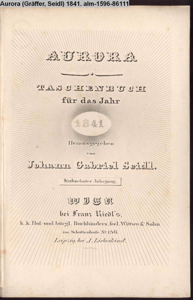 AURORA / TASCHENBUCH / für das Jahr / 1841 / Herausgegeben / von / Johann Gabriel Seidl. / Siebzehnter Jahrgang. / WIEN / bei Franz Riedl's / k.k. Hof- und bürgl. Buchbinders seel. Wittwe & Sohn / im Schottenhofe No. 136. / Leipzig, bei A. Liebeskind