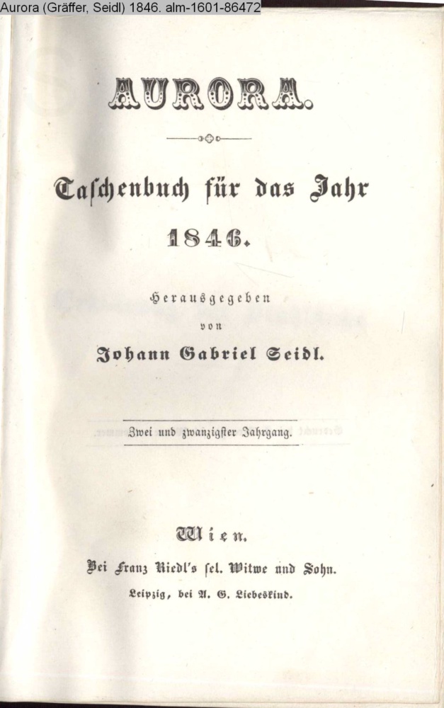 AURORA. / Taschenbuch / für das Jahr / 1846. / Herausgegeben / von / Johann Gabriel Seidl. / Zwei und zwanzigster Jahrgang. / Wien. / Bei Franz Riedl's sel. Witwe und Sohn. / Leipzig, bei A. G. Liebeskind