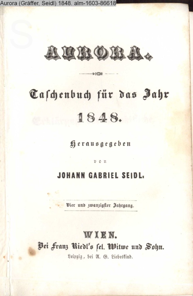 AURORA / Taschenbuch für das Jahr / 1848. / Herausgegeben / von / JOHANN GABRIEL SEIDL. / Vier und zwanzigster Jahrgang. / WIEN. / Bei Franz Riedl's sel. Witwe und Sohn. / Leipzig, bei A. G. Liebeskind