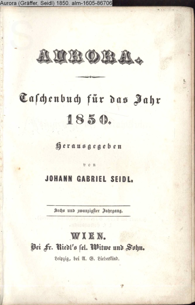 AURORA / Taschenbuch für das Jahr / 1850. / Herausgegeben / von / JOHANN GABRIEL SEIDL. / Sechs und zwanzigster Jahrgang. / WIEN. / Bei Fr. Riedl's sel. Witwe und Sohn. / Leipzig, bei A. G. Liebeskind
