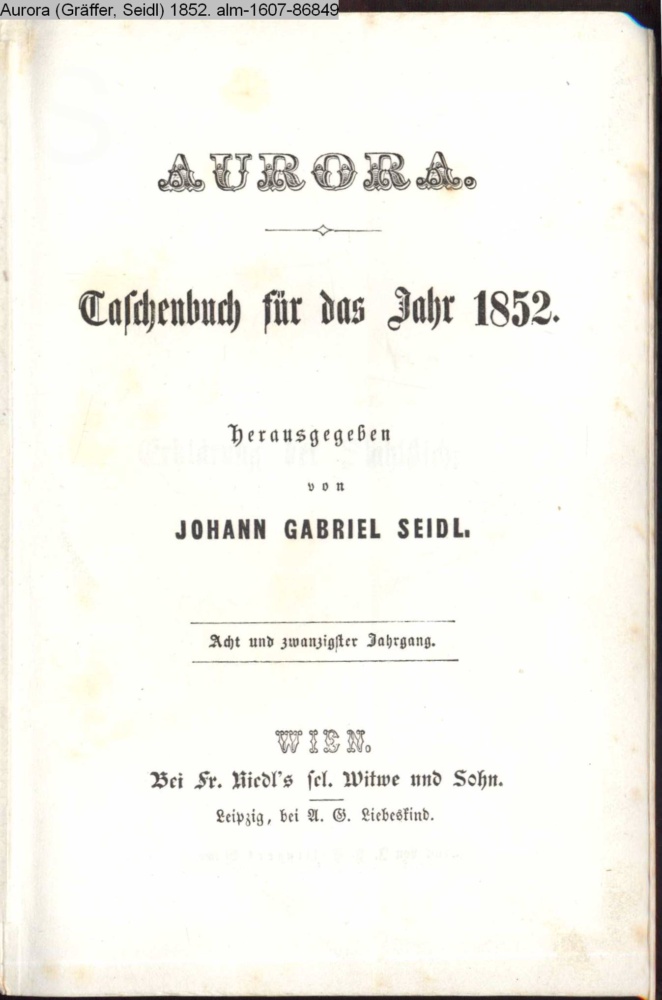 AURORA. / Taschenbuch für das Jahr 1852. / herausgegeben / von / JOHANN GABRIEL SEIDL. / Acht und zwanzigster Jahrgang. / WIEN. / bei Fr. Riedl's sel. Witwe und Sohn. / Leipzig, bei A. G. Liebeskind