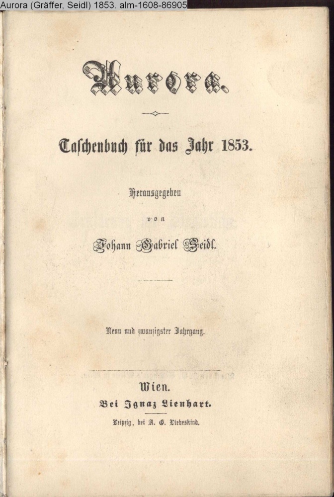AURORA. / Taschenbuch für das Jahr 1853. / Herausgegeben / von / Johann Gabriel Seidl. / Neun und zwanzigster Jahrgang. / Wien. / Bei Ignaz Lienhart. / Leipzig, bei A. G. Liebeskind