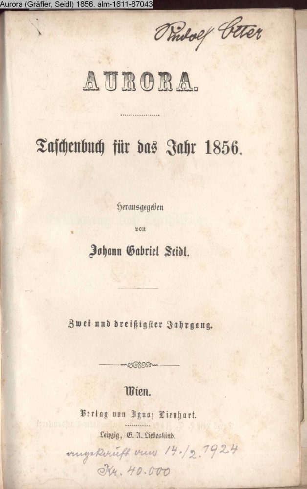 AURORA. / Taschenbuch für das Jahr 1856. / Herausgegeben / von / Johann Gabriel Seidl. / Zwei und dreißigster Jahrgang. / Wien. / Bei Ignaz Lienhart. / Leipzig, bei G. A. Liebeskind