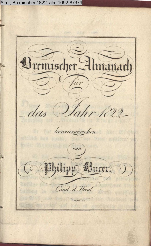 Bremischer Almanach / für / das Jahr 1822. / herausgegeben / von / Philipp Bucer. / Cand. d. Theol.