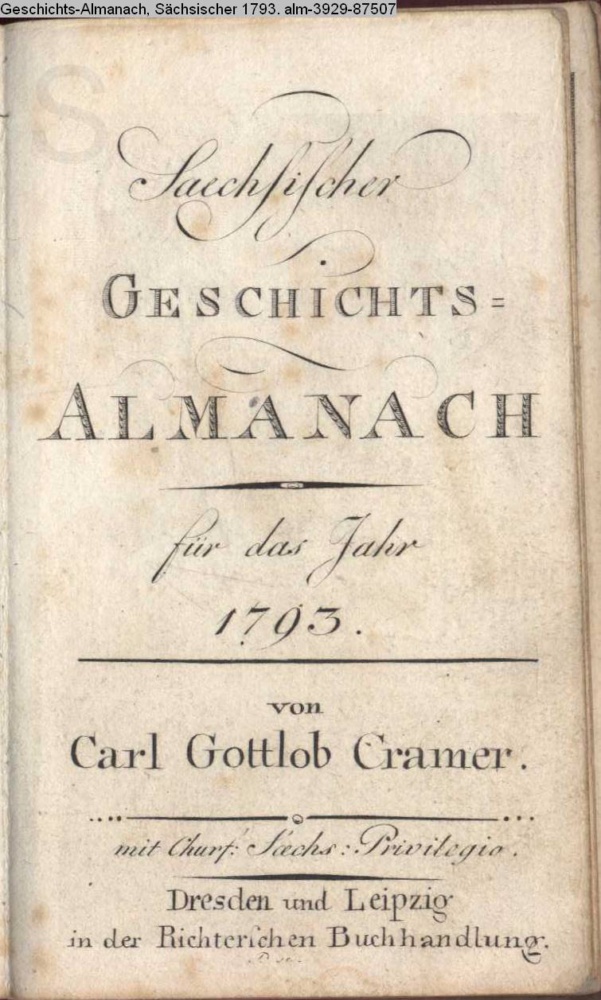 Saechsischer / GESCHICHTS- / ALMANACH / für das Jahr / 1793. / von / Carl Gottlob Cramer. / mit Churf.-Saechs. Privilegio. / Dresden und Leipzig / in der Richter'schen Buchhandlung