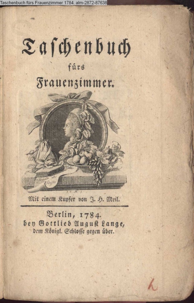 Taschenbuch / fürs / Frauenzimmer / Mit einem Kupfer von J. H. Meil. / Berlin, 1784. / bey Gottlieb August Lange, / dem Königl. Schlosse gegen über